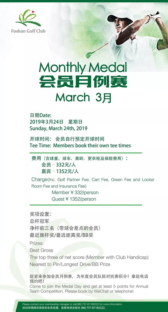 2019年佛山高尔夫球会“会员月例赛日”将沿用积分赛制,带给您更多竞技的趣味和期待!除了丰富的奖项及奖品,所有参赛会员均可获得5个参赛积分,排名领先的会员更可额外获得奖励积分。全年会员赛事累计积分排名前24的会员,将晋级2019年度“会员队际对抗赛”。参加三月会员月例赛的男士会员将有机会晋级年度差点比洞赛!