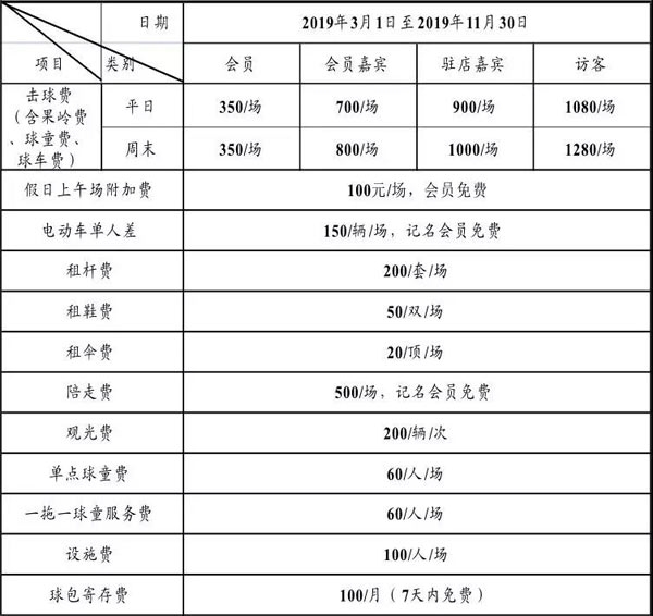 2019年度黄山松柏高尔夫球会综合收费价目表