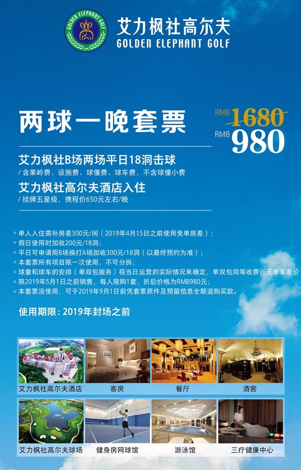 艾力枫社高尔夫套票优惠:980元两球一晚