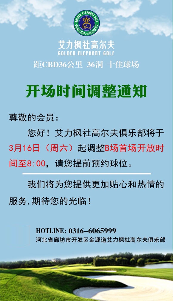艾力枫社高尔夫B场首场开放时间调整: