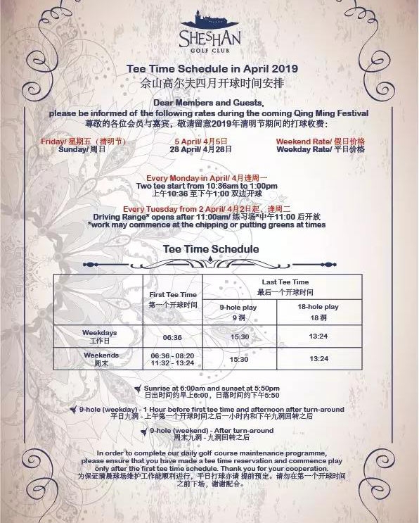 尊敬的各位会员与嘉宾,敬请留意2019年清明节期间的打球收费: