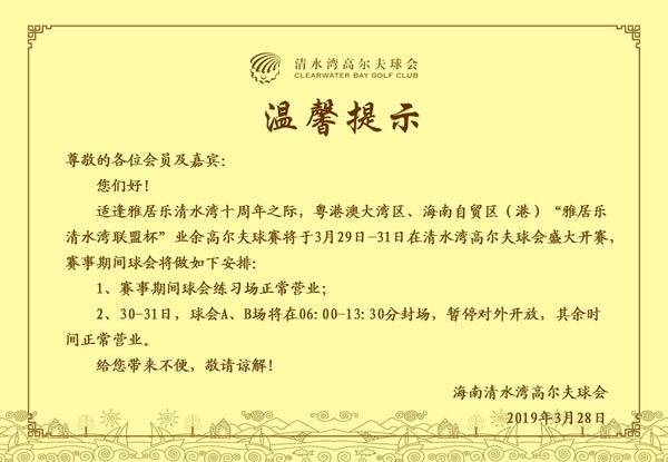 清水湾高尔夫球会3月29日-31日营业时间安排: