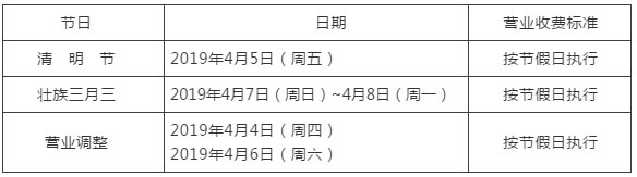根据《国务院办公厅关于2019年部分节假日安排的通知》,以及广西壮族自治区人民政府办公厅发布的《2019年“壮族三月三”放假的通知》,结合本球会实际运营需要,为便于您安排节日行程,现将球会2019年清明节、壮族“三月三”假期安排及营业收费调整公告如下: