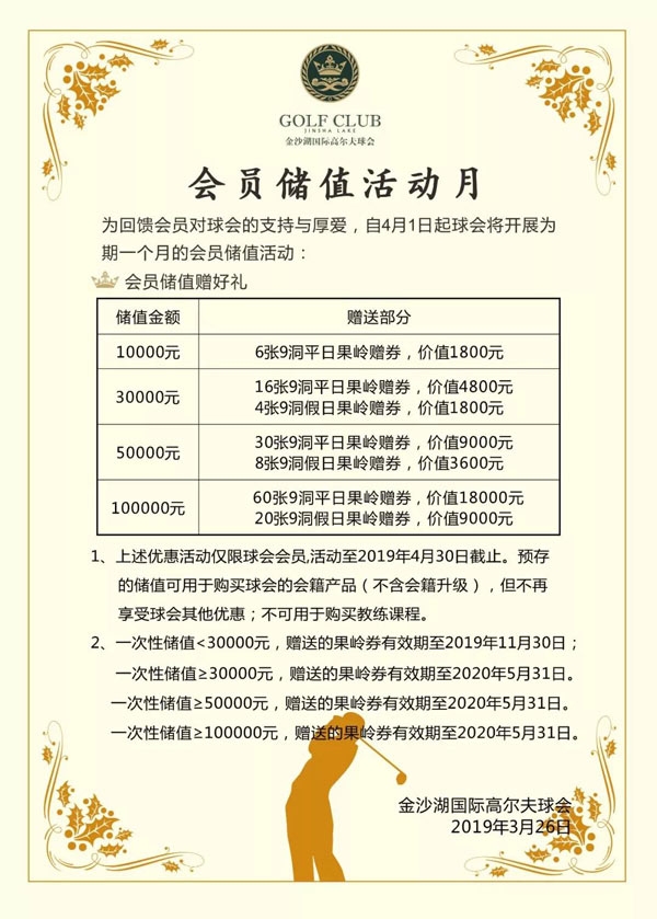 即日起缴纳2019年管理费均赠送两张节假日果岭券,金鼎会籍均赠送四张节假日果岭赠券。(果岭赠券有效期:自交付日起三月内有效)。