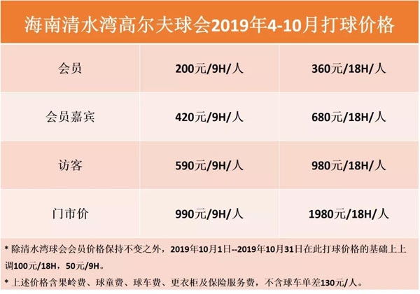 自2019年4月1日—2019年10月31日,清水湾高尔夫球会打球价格调整如下: