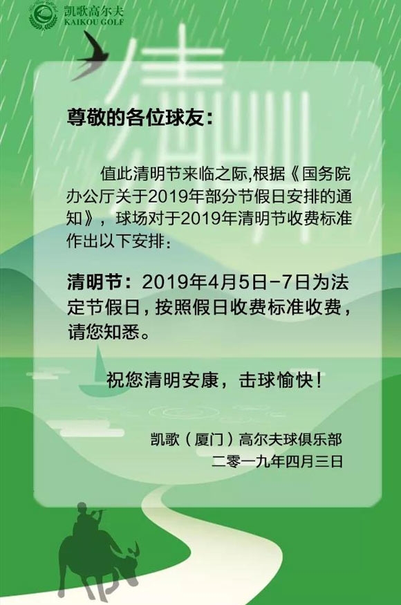 厦门凯歌高尔夫球会关于清明节收费调整公告