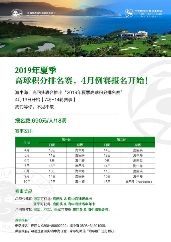 海中海、鹿回头联合推出“2019夏季高球积分排名赛”,4月例赛报名开始!