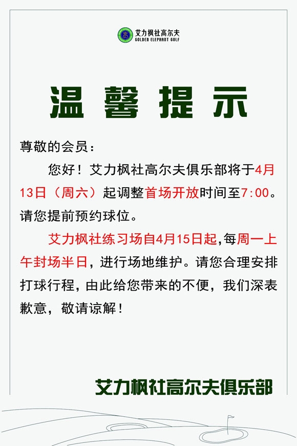 艾力枫社高尔夫俱乐部将于4月13日(周六)起调整首场开放时间至7:00。请您提前预约球位。
