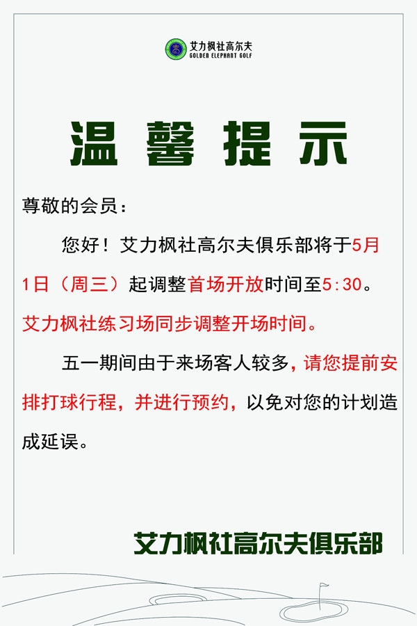 河北廊坊艾力枫社高尔夫首场开放时间调整公告