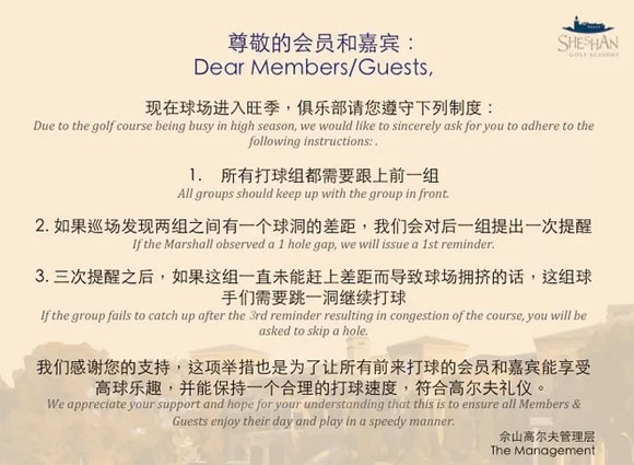 我们感谢您的支持,这项举措也是为了让所有前来打球的会员和嘉宾能享受高球乐趣,并能保持一个合理的打球速度,符合高尔夫礼仪。