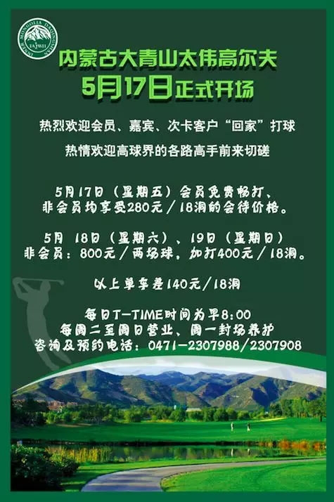 迎着大青山和煦的春风,身披蓝天下明媚的阳光,大青山太伟高尔夫球场即将于5月17日(星期五)正式开场。