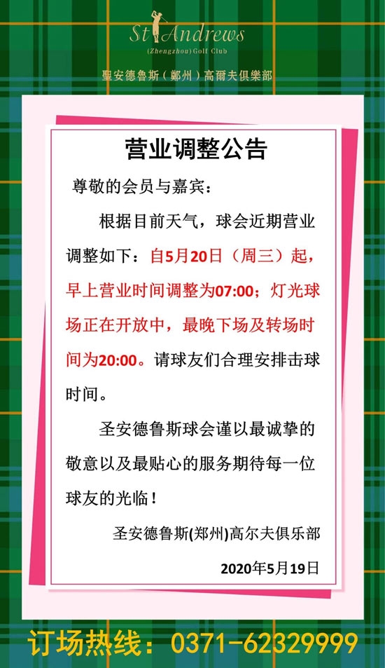 圣安德鲁斯郑州高尔夫俱乐部营业调整公告