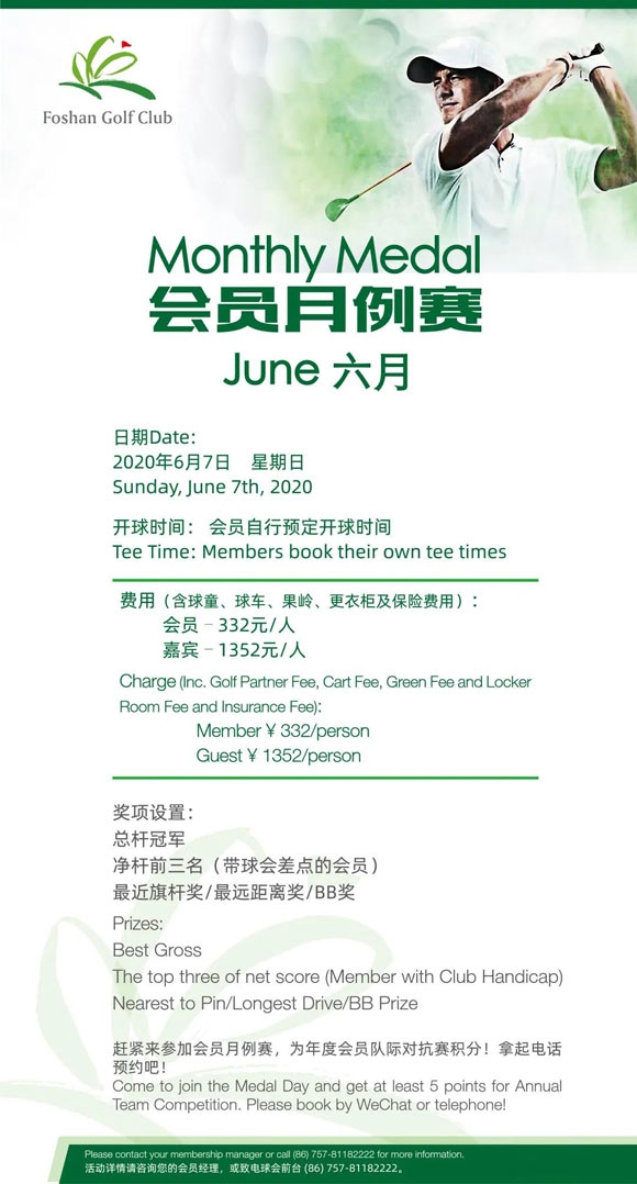 2020.6.7,2020年佛山高尔夫球会“会员月例赛日”沿用积分赛制,除了丰富的奖项及奖品,所有参赛会员均可获得5个参赛积分,排名领先的会员更可额外获得奖励积分!