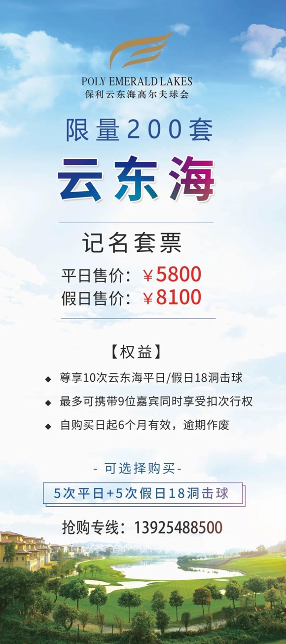 保利云东海平、假日打球套票开售了,限时、限量200套,赶紧抢购哦~~~