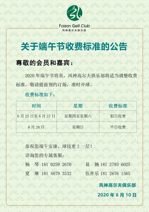 【公告】风神高尔夫端午节期间收费标准须知