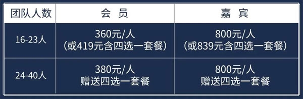 ·24人以上团队,球队会长及总干事尊享600元/人(赠送四选一套餐)。