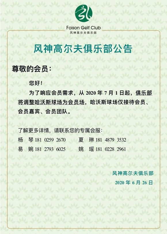 广州风神高尔夫俱乐部会员专用球场调整公告