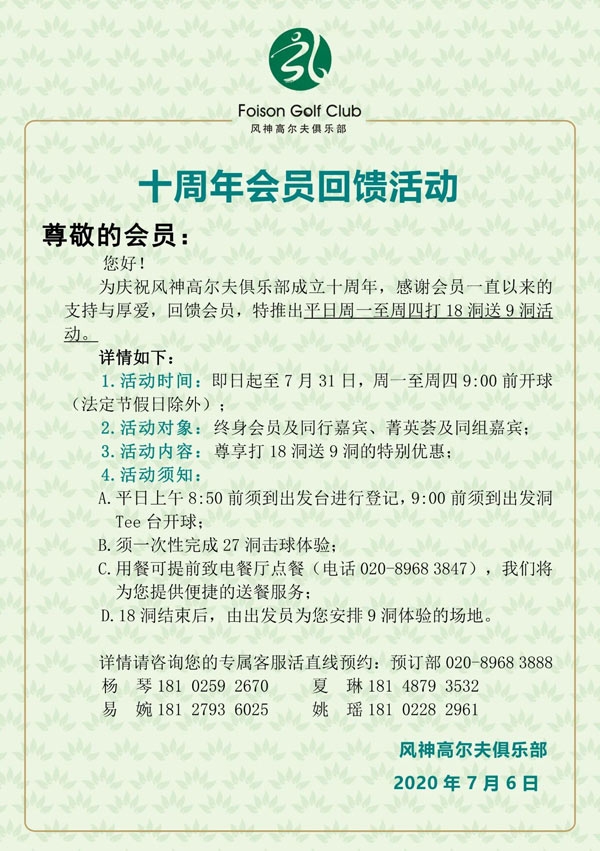 广州风神高尔夫俱乐部十周年会员回馈活动来袭