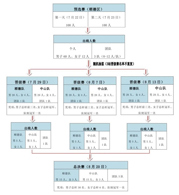 1、精英赛分为预选赛(顺德区)、三站晋级赛和一站总决赛3个阶段;
