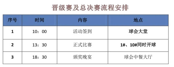 4、分组表及出发时间将提前三天公布,请参赛者提前10分钟到达出发台。迟到5分钟之内的加罚两杆,迟到时间超过五分钟取消参赛资格。