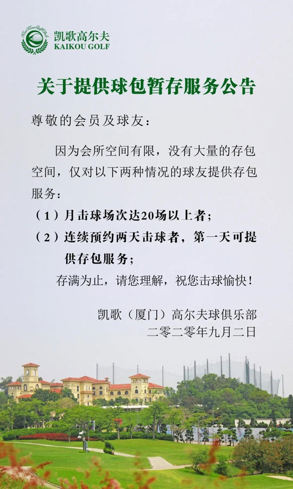 厦门凯歌高尔夫关于提供球包暂存服务公告