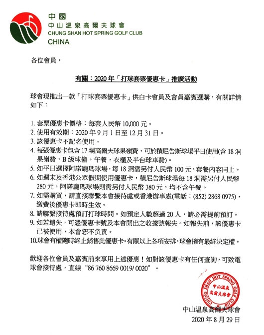 广东中山温泉高尔夫2020年打球套票优惠卡推广活动