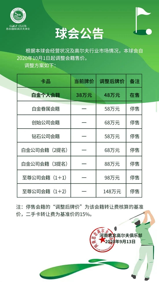 郑州思念国际高尔夫球会会籍价格调整公告