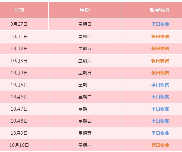 国庆中秋假期收费标准