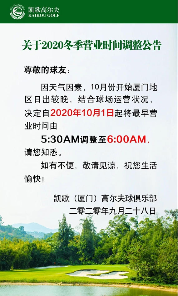 厦门凯歌高尔夫关于2020年冬季营业时间调整公告