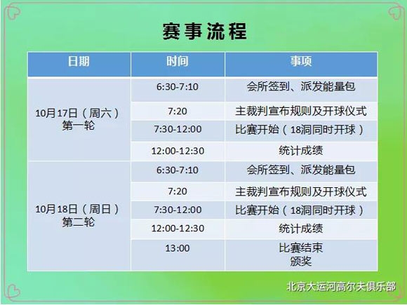 北京大运河高尔夫俱乐部10月17-18日赛事期间预订安排