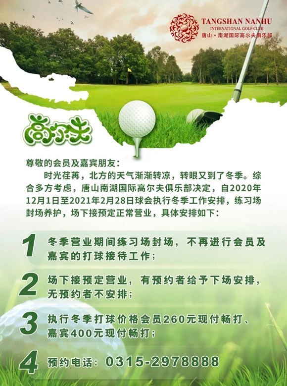 唐山南湖高尔夫冬季营业安排通知!