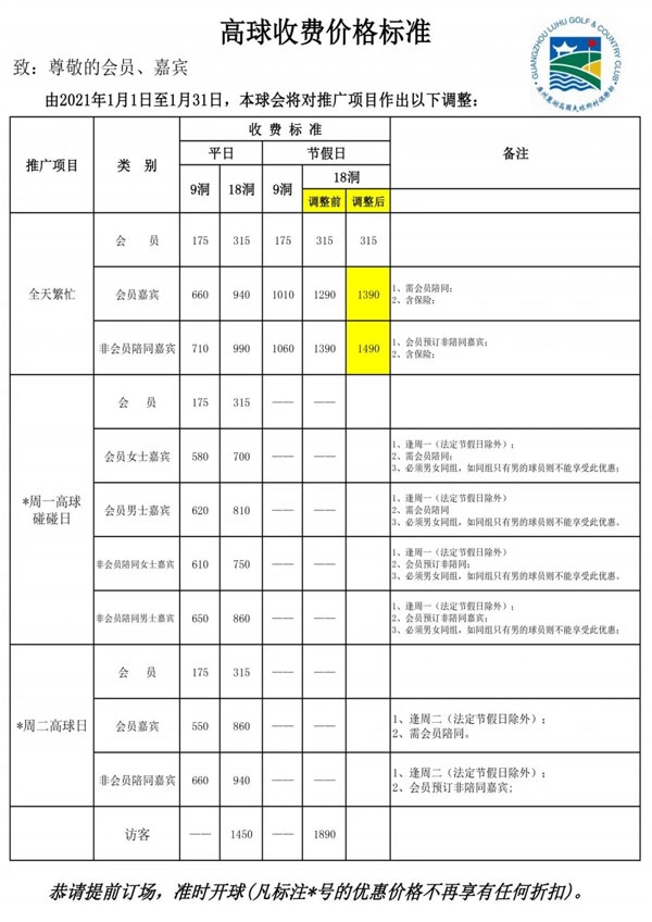 温馨提示 ▏2021年1月高球收费标准
