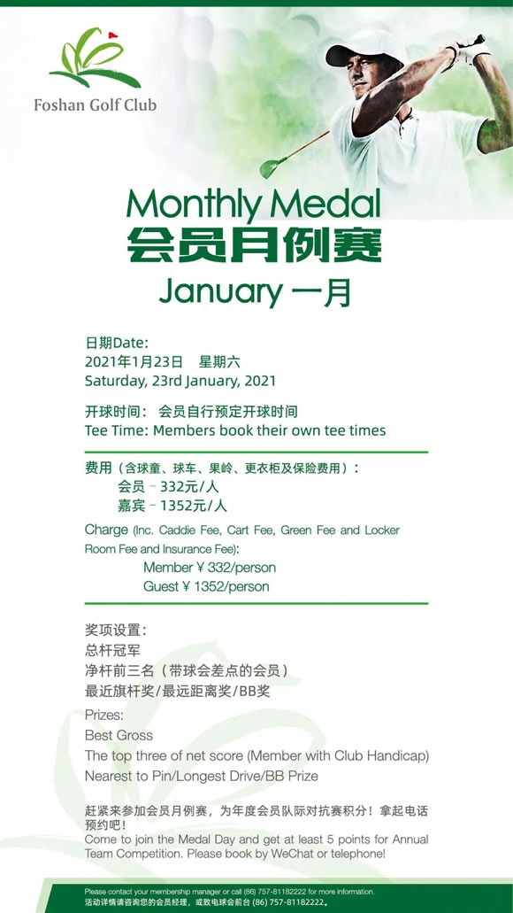 报名:佛山高尔夫球会2021年一月会员月例赛