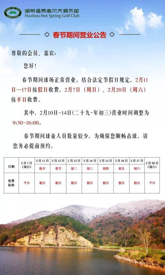 2021年春节期间湖州温泉高尔夫俱乐部营运安排!