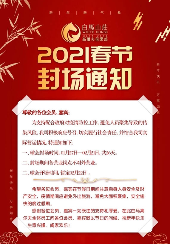 安徽宣城白马山庄高尔夫2021春节封场通知