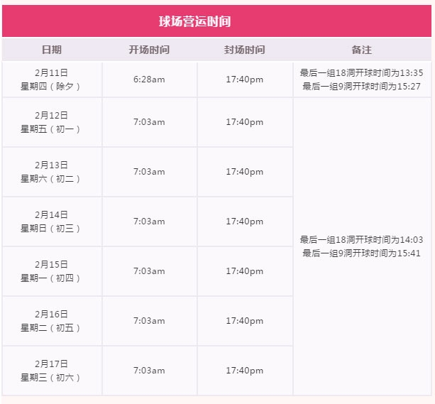 为了使您在春节期间合理安排打球时间,现将春节期间运营时间安排通知如下: