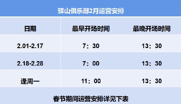【到驿山,过牛年】武汉驿山俱乐部2月营业安排