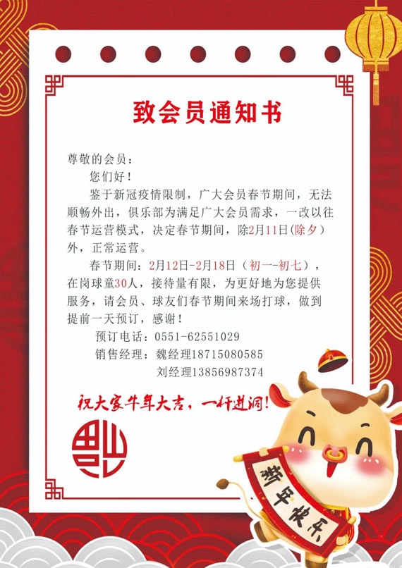 致会员的通知书!合肥紫蓬湾高尔夫春节期间营业安排