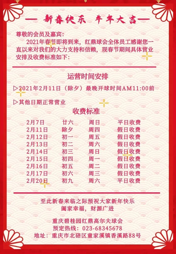 新春来临之际,碧桂园红鼎球会放假时间及收费标准: