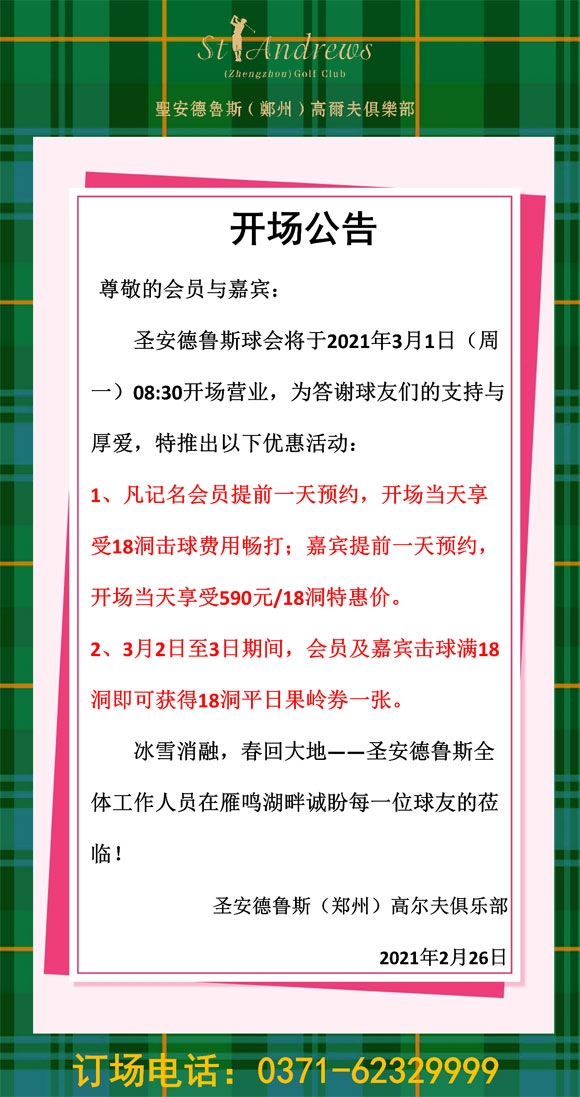 开场公告 | 圣安德鲁斯郑州高尔夫俱乐部球会3月1日正式开场营业!