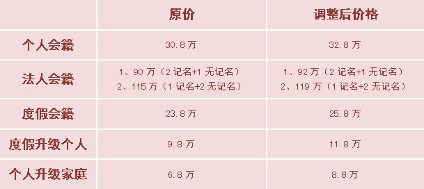 会籍价格调整