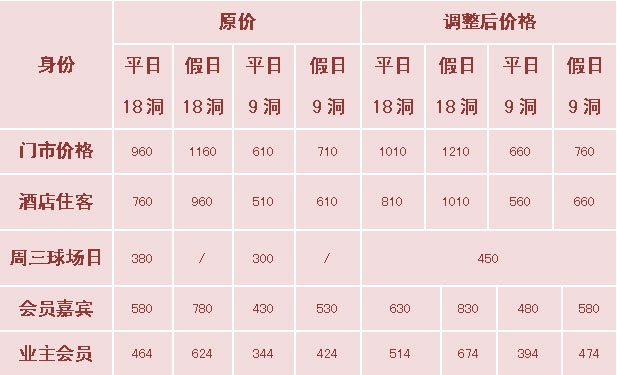 泰州云海湿地高尔夫球会价格调整公告