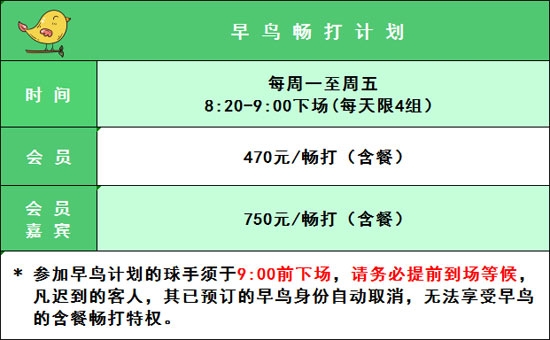 为喜迎开场,球会特推出开场早鸟畅打计划。希望在您度过漫漫冬季后,多来打球暖身,并祝您在2021年喜乐安康!球技进步!