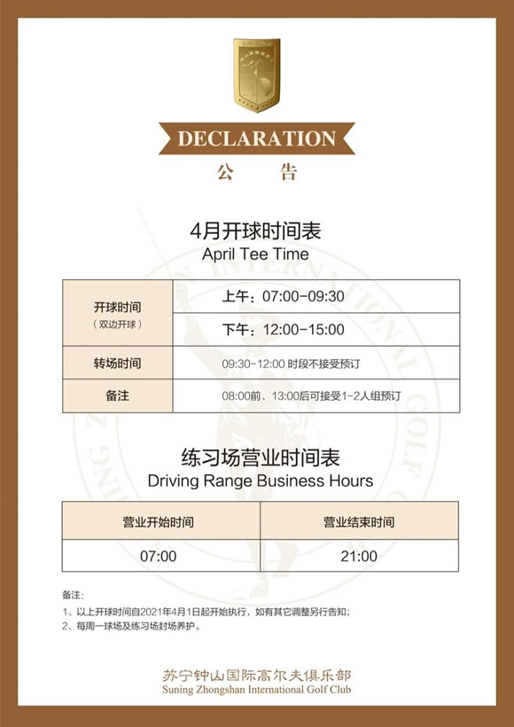 苏宁钟山国际高尔夫TEE TIME预约规范及4月运营时间调整