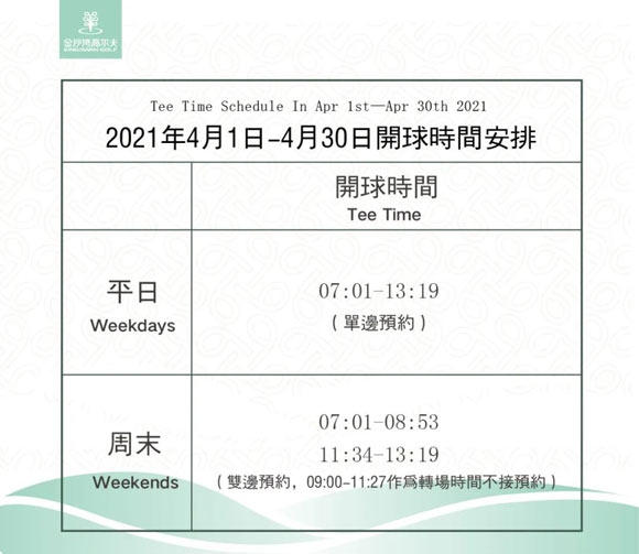 您好,金沙湾乡村俱乐部4月时间开球安排如下: