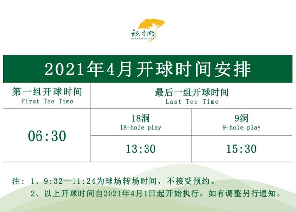 为了给球友们提供更多畅享挥杆的机会,现对本俱乐部四月份的运营时间做出调整,安排如下: