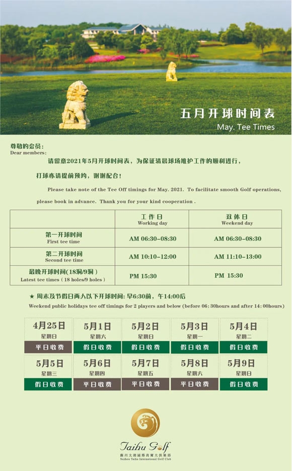 苏州太湖国际高尔夫俱乐部五月开球时间表