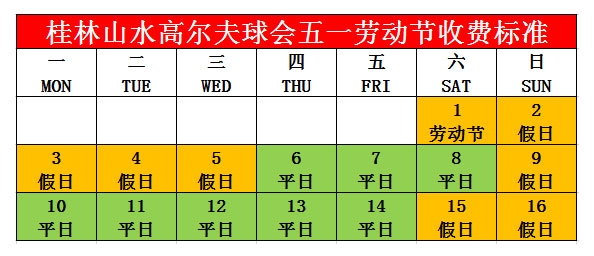 根据国务院办公厅关于2021年五一放假安排,桂林山水高尔夫球会收费标准如下: