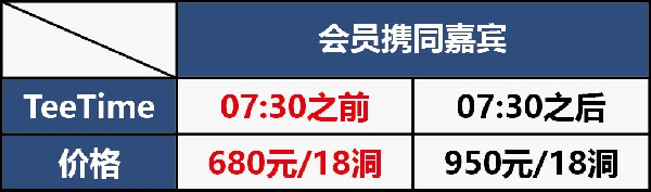 ※此优惠活动仅限平日早场07:30之前的TeeTime,以出发站的实际出发时间为准。※平日超出限定的时段击球,则按正常嘉宾价950元/18洞收取。
