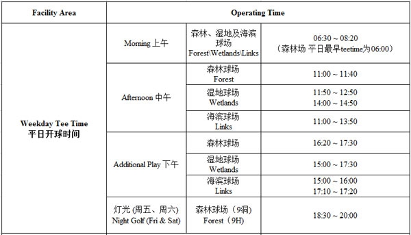 您好!俱乐部自2021年8月16日(星期一)起,森林场平日最早开球时间调整为06:00(如遇森林场维护,将根据实际情况调整场地),调整后的具体开球时间如下:
